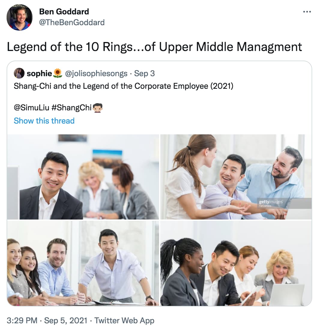 Published Sep 12 2021 A fan managed to collect every stock photo of the Shang-Chi actor and created a single thread on Twitter full of hilarious fan edits.